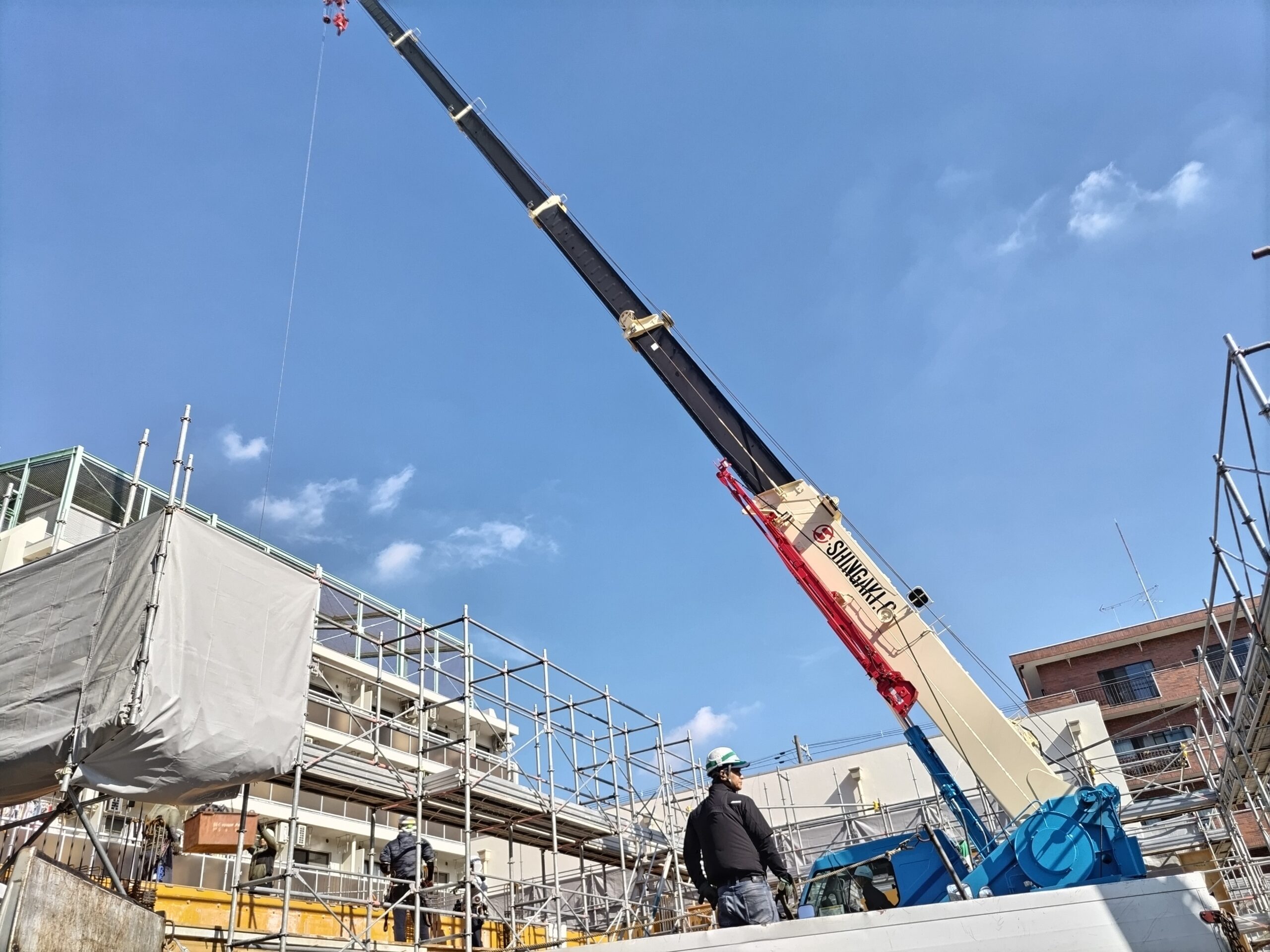 青空にクレーン車が映えています。