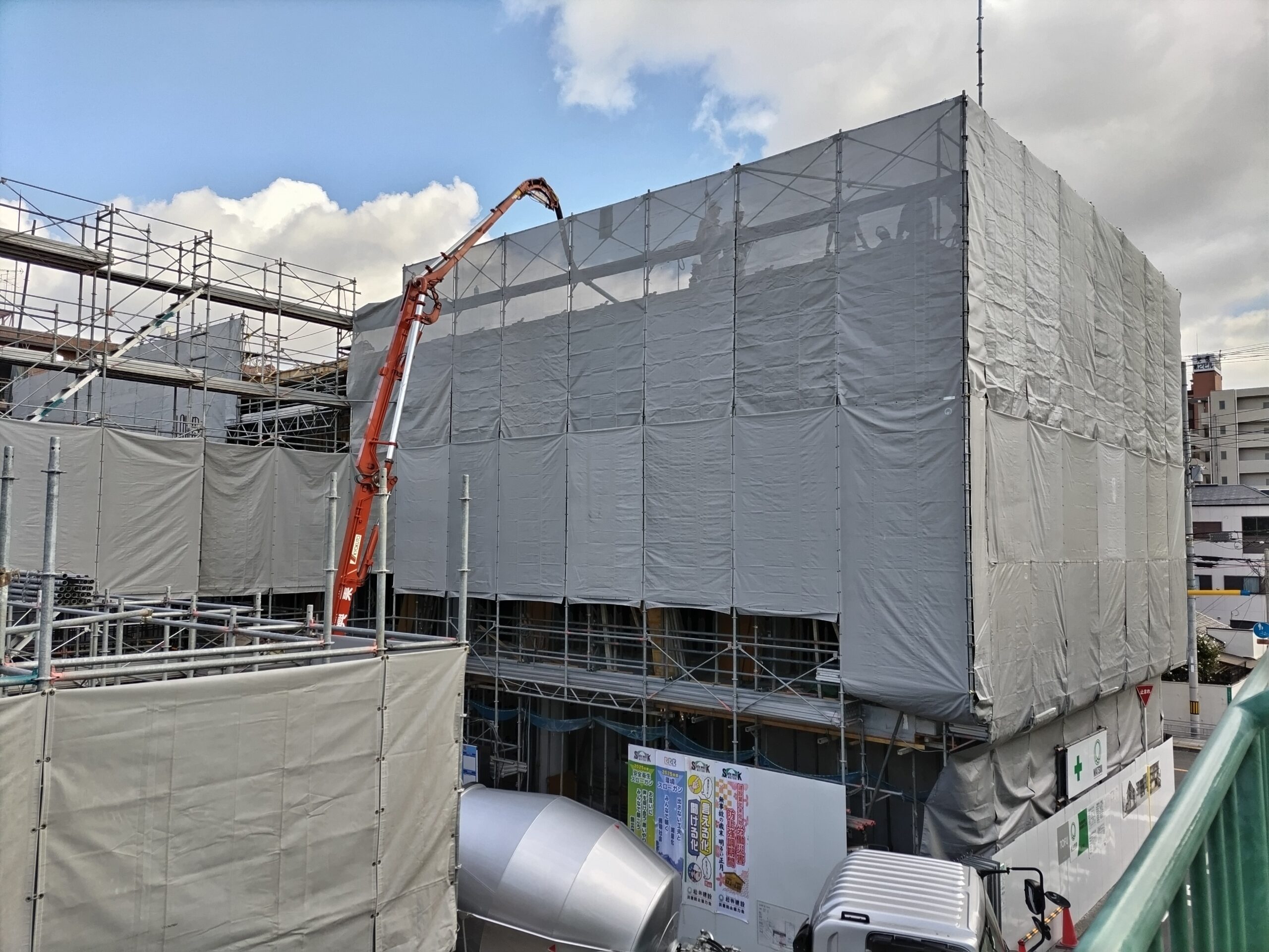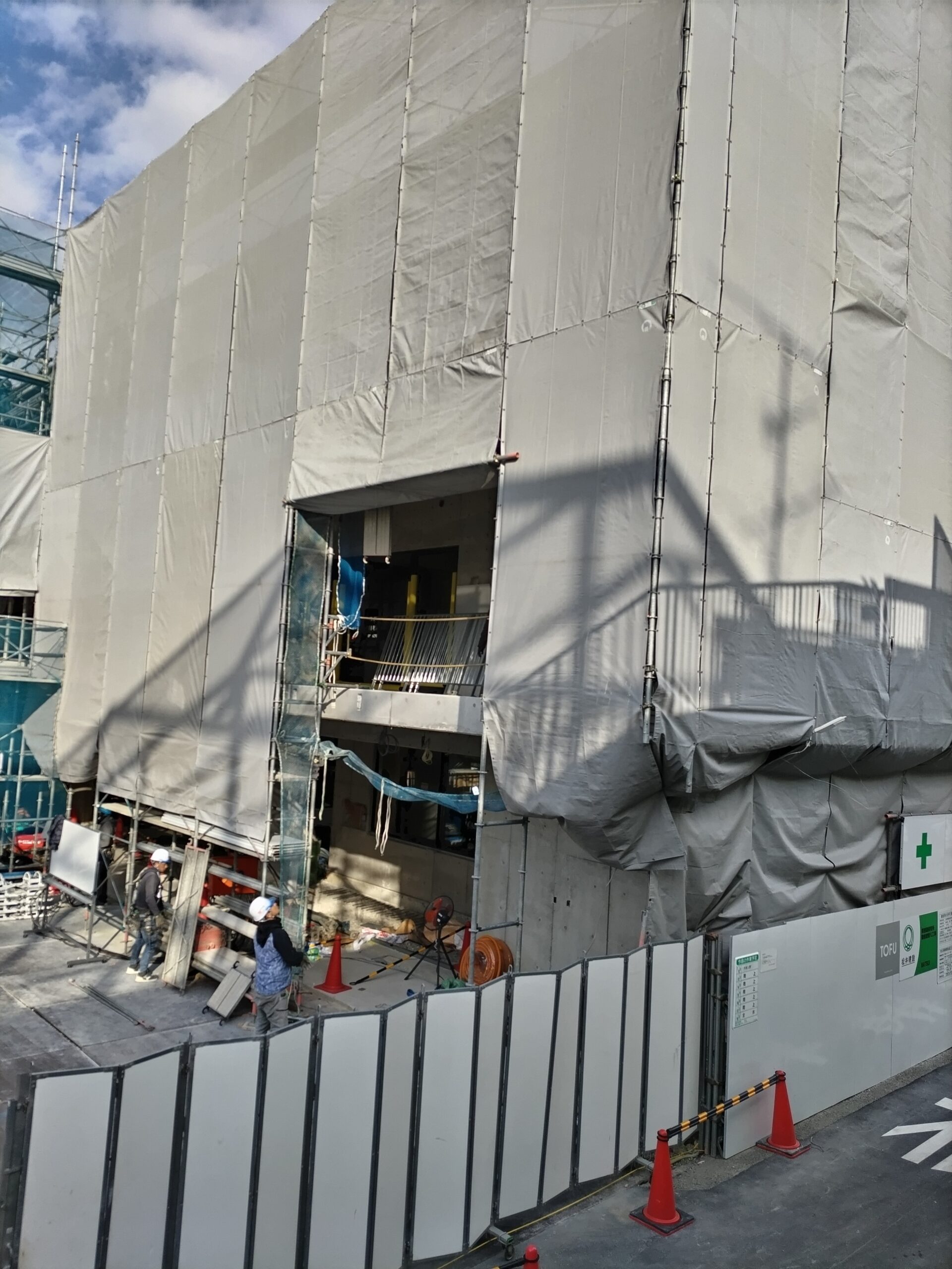 防音シートで建物がすっぽりとおおわれました。